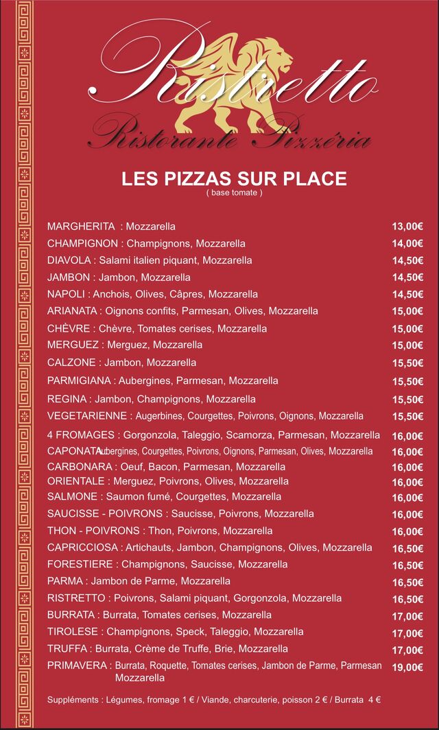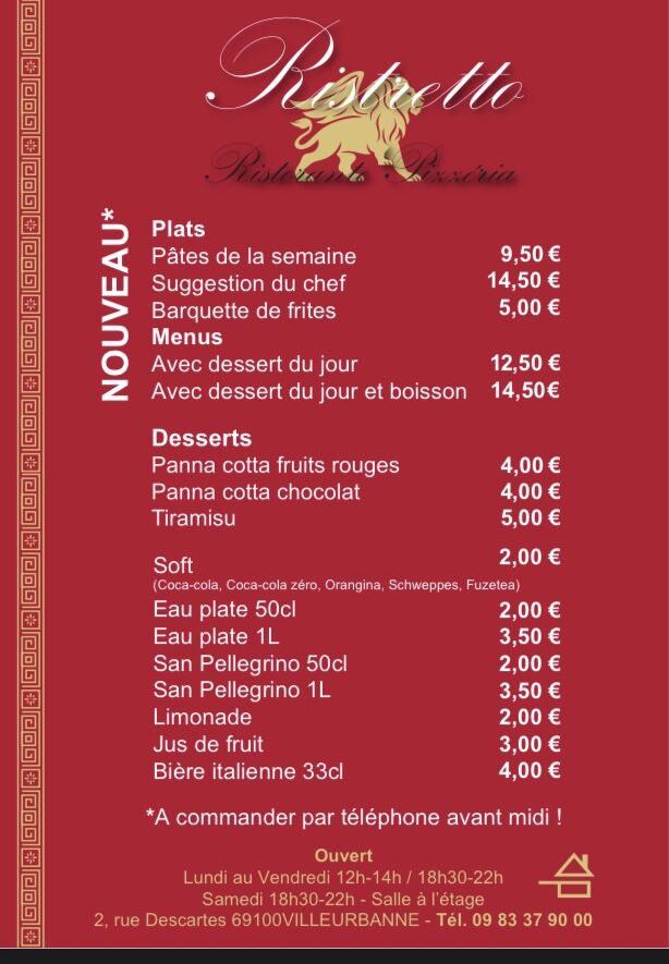 APPELER +330983379000Bienvenue chez Ristretto situé dans la belle ville de VILLEURBANNE. Nous avons hâte de vous accueillir ! Envie d'une délicieuse cuisine italienne ? Notre équipe chaleureuse vous servira le meilleur. Notre service de restauration rapide est excellent. Nos savoureuses pizzas vous attendent ! Venez déguster vos plats préférés. Les plus gourmands apprécieront notre délicieux tiramisu. Nous nous adaptons à tous les régimes alimentaires et proposons un large choix d'options halal. Une petite faim ? Venez nous rendre visite et savourez un déjeuner et un dîner savoureux dans un espace convivial. Notre service haut de gamme est agrémenté d'une musique agréable. [[[Une aventure culinaire italienne inoubliable !]]] Découvrez le plaisir d'un repas gastronomique à domicile grâce à notre service à emporter. Le Wi-Fi est gratuit. Plusieurs options de paiement sont acceptées. Nous sommes là pour vous aider ! Contactez-nous pour réserver votre table.